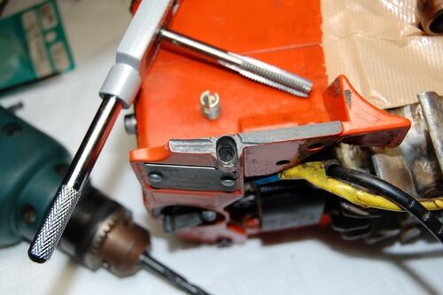 外は氷雨なので、 先日頂戴した254のネジ穴修復。 ここまで損傷しているとヘリコイルは無理ですね。 クランク内へ金属粉侵入を防ぐためガムテープで密閉。 ドリルで下穴を拡大してM8でタッピング。 エンザートをねじ込んで終了。 ガッチリ食い込んで実…
