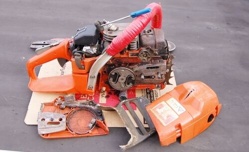 車の後ろへ置いたのを忘れてバックしたとか。 なんとかブレーキを解除してクラッチカバーを取り外し。 Fハンドルもグニャリです。 ブレーキレバーやシュラウドはアウトですね。 プラグは割れたけどシリンダは無事かも。 こんなプラグは初めて見ました。 ケ…