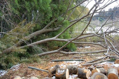 チル2本掛けで引き倒し 色味は良好ですが 曲がりがあるので材にはならないかも ワイヤー回収に難儀しました