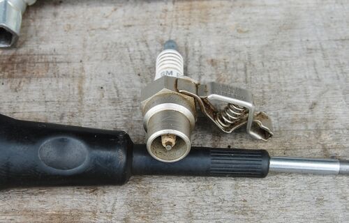 テストプラグで発火確認、残念ながら火花見えず。 プラグ先端をシリンダへ押し付けて点火確認をやる人がいますが絶対NGです。スタータを引いた瞬間にプラグが少しでも浮いたら、コイルで発生した高圧電流はコイル内部でスパークします・・・これで本当に点火…