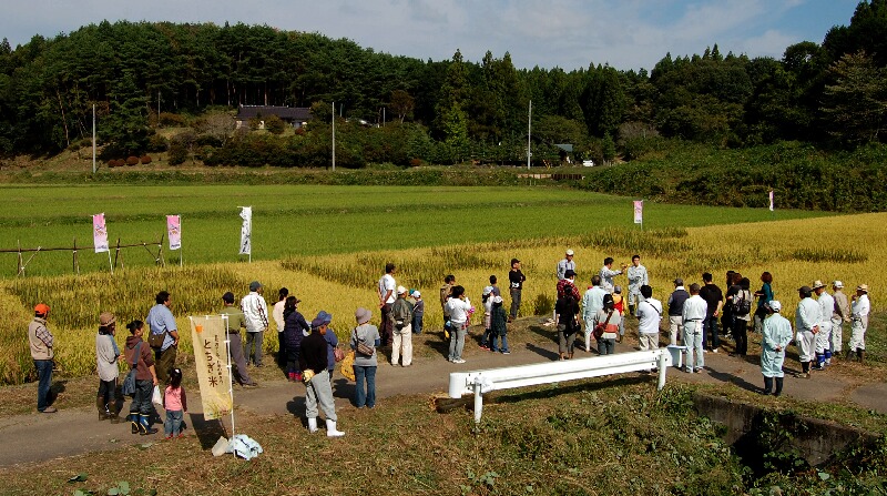 2012-10-14 収穫祭 近郊散策 #その他趣味 休耕田を利用して水田アートのつもりですが、今年も日光の手前かな。【いまいち】 目的は地域の子供達の農業体験 海外からの研修生も稲刈り体験 はさ掛けの前で記念撮影 公民館で懇親会 地域の集落営農組合主催で、今年で6年目になります。 震災前は隣接する林間住宅地から、大勢の親子連れで賑わったのですが。