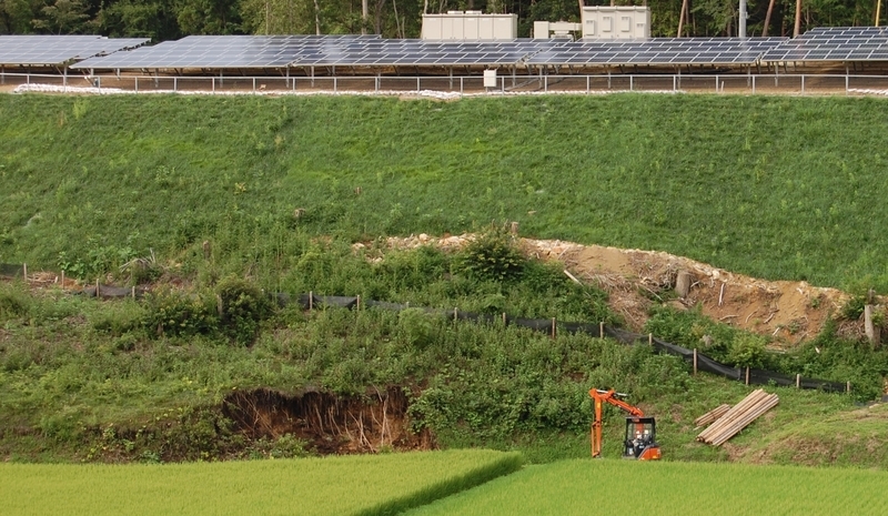2015-07-24 乱開発のツケ 太陽光パネル斜面崩落 #栃木県 崩落場所に眼を奪われていたけれど、のり面上部の盛土で地すべり?が始まった模様。 画像を拡大すると防護柵の歪みが見えます。 計画では防護柵内側の排水路はU字溝設置となっていたが素掘り。 パネルを設置した斜面全体が崩落する可能性も出てきました。 水路へ鉄板を渡して小型ユンボを入れたようです。