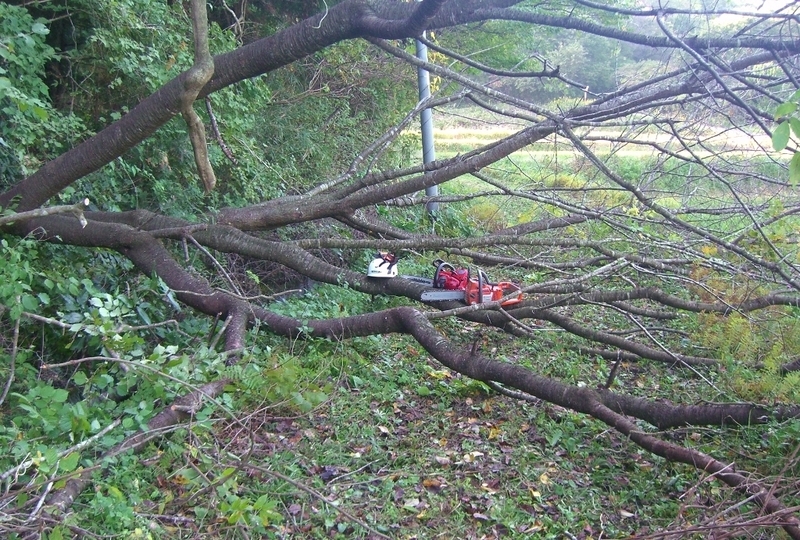 2016-10-27 小桜伐倒 伐倒・伐採 #その他趣味 午後時間が空いたので、農道へ被さった山桜伐倒。 ハスク339と新ダイワ1127Sを使用。 どちらも小型軽量機ですが30cm前後までの材なら実力充分、と言うよりも体力的に楽チンです。